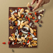 200 Gram krachtige 72% pure chocolade met een gemixte topping van bessen, noten en kokos die voor een heerlijke balans tussen bitter en zoet zorgen. De notenmix bestaat uit walnoten, amandel, cashewnoten, pistache en pompoenpitten. De bessenmix bestaat uit cranberries, bosbessen, gojibessen, inca bessen en moerbeien.
